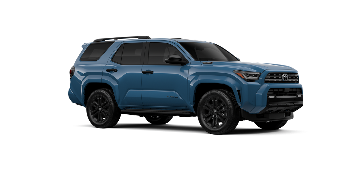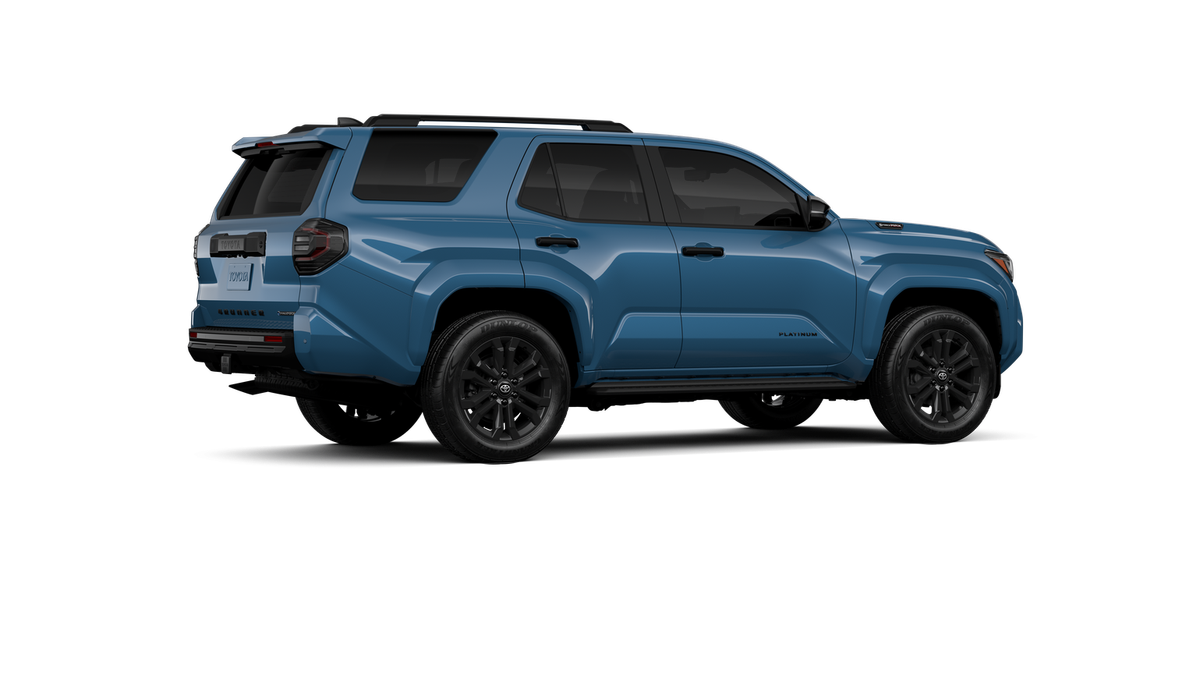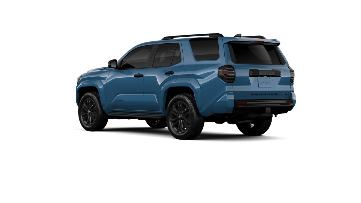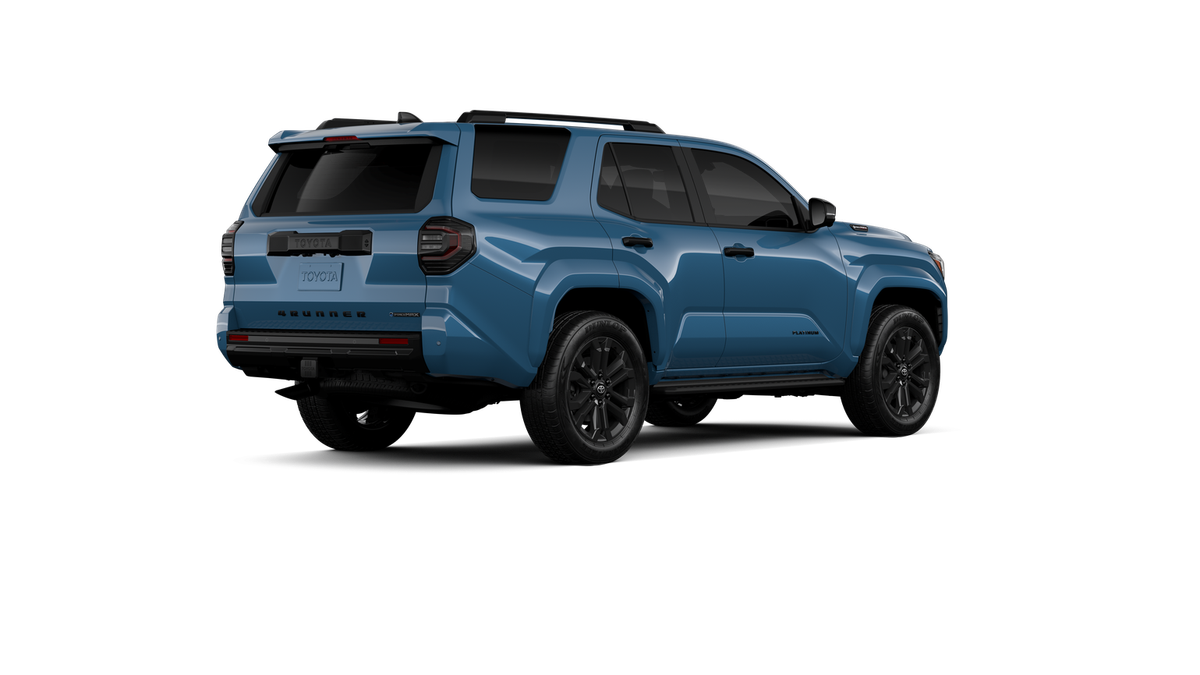 - Dark-chrome tri-bar grille; gloss-black mirror caps and door handles; color-keyed overfenders and rear spoiler; gloss-black "PLATINUM" and "4RUNNER" badges