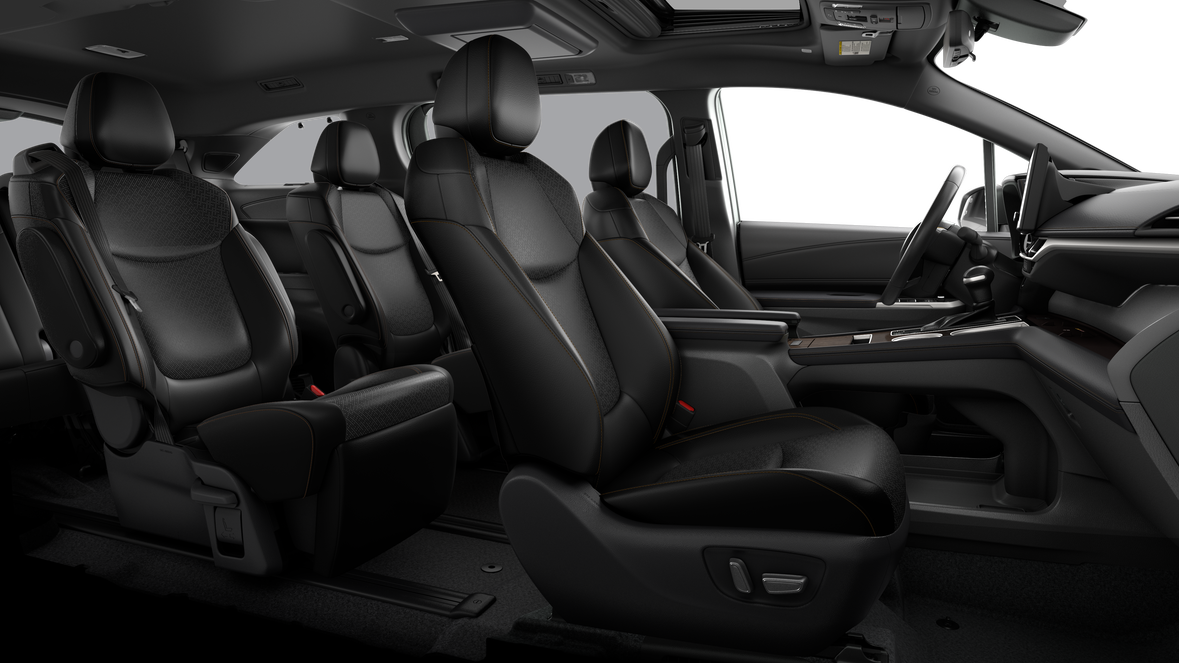 - 7-passenger seating with premium leather-trimmed second-row-seat captain's chairs with super-long-slide feature and ottomans
